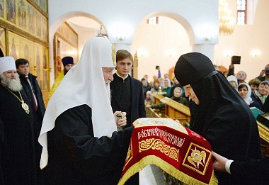 С ответным словом к Его Святейшеству обратилась игумения Филарета (Калачева). Ее Высокопреподобие преподнесла Святейшему Владыке напрестольную плащаницу, вышитую пюхтицкими сестрами, В.Ю. Алекперову – картину с видом Пюхтицкого монастыря, написанную сестрами Пюхтицкой обители.