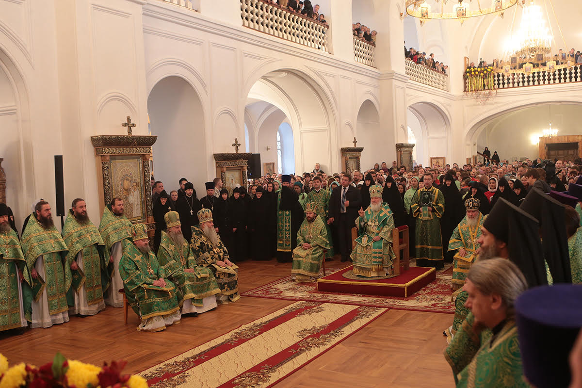 По окончании Литургии Святейший Патриарх Кирилл обратился к епископу Егорьевскому Тихону со словом напутствия и вручил ему архиерейский жезл. По традиции новорукоположенный епископ преподал верующим первое архипастырское благословение.