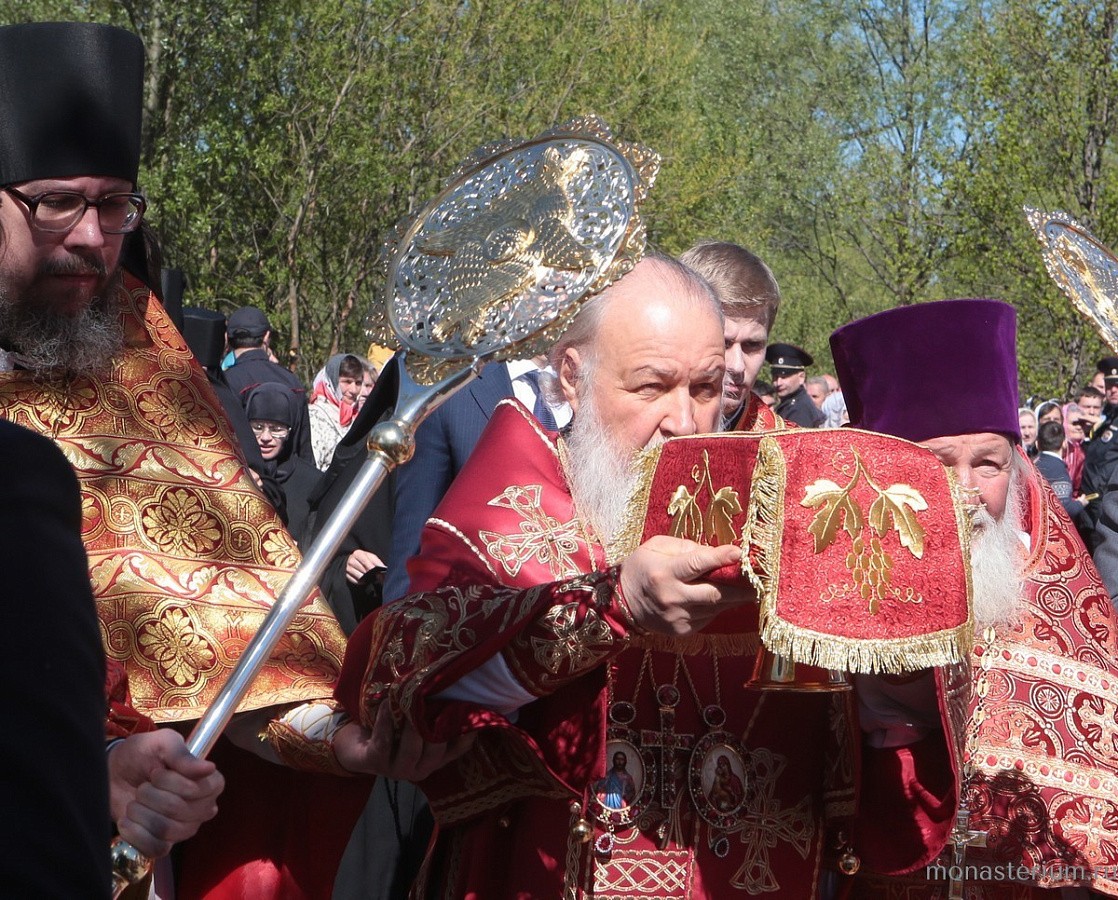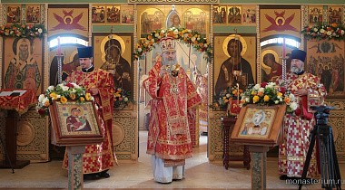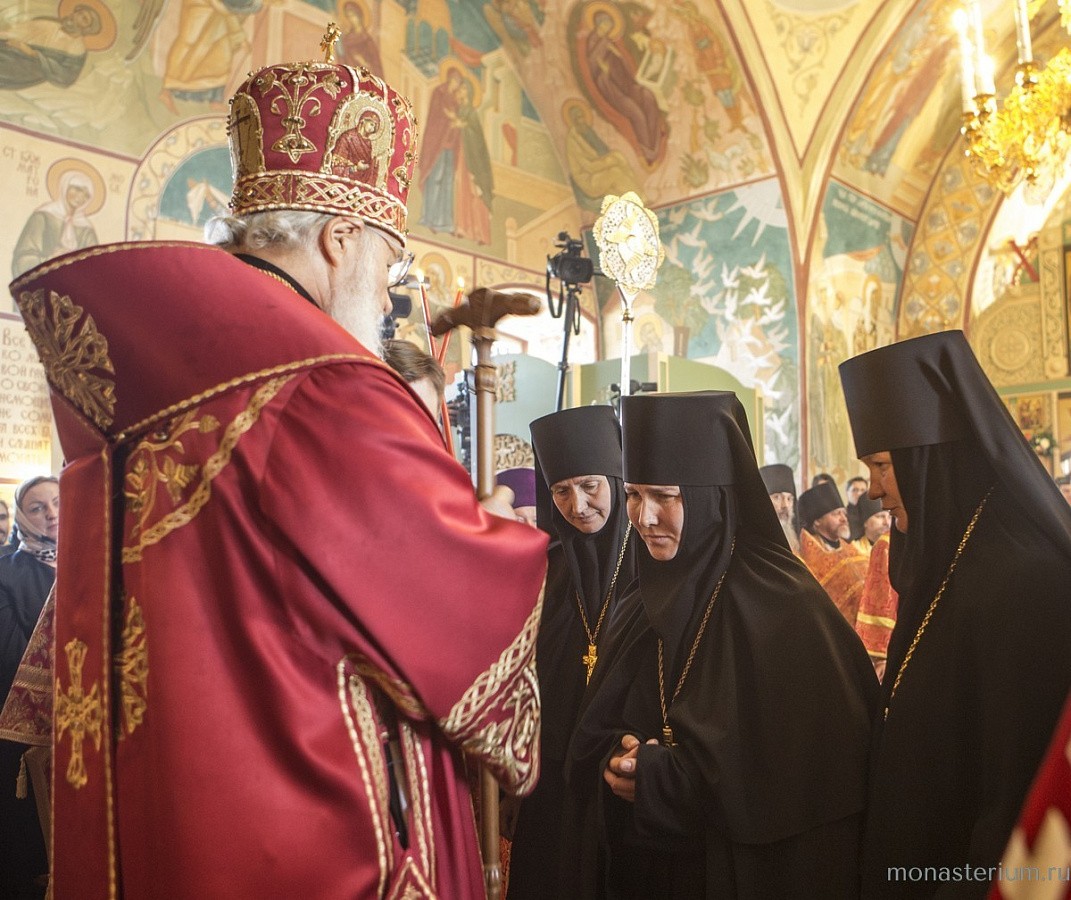 По окончании богослужения игумения Неонилла приветствовала Святейшего Владыку и преподнесла Его Святейшеству миниатюрные иконы Спасителя и Божией Матери.