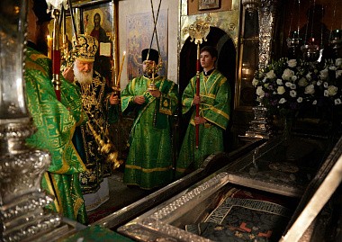 Святейший Владыка проследовал в Троицкий собор Лавры, где поклонился честным мощам преподобного Сергия Радонежского.