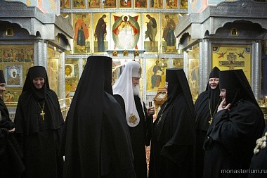 После братской трапезы Святейший Патриарх Московский и всея Руси Кирилл в сопровождении игумена Варфоломея (Петрова) посетил Никольский собор монастыря.