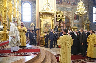 По прибытии в собор Предстоятель Русской Православной Церкви вознес молитву у ковчега с частицей мощей святителя Николая Чудотворца, а также поклонился честным мощам преподобного Пимена Угрешского.