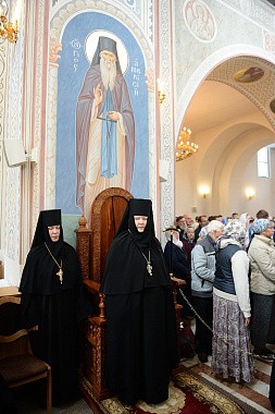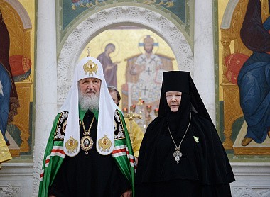 По окончании богослужения Святейшего Патриарха Кирилла приветствовала игумения Олимпиада, которая преподнесла Его Святейшеству Смоленскую икону Божией Матери, написанную сестрами обители.