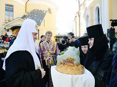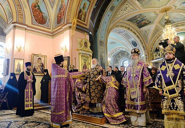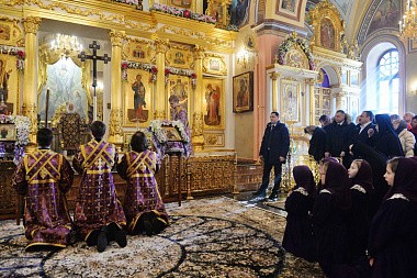 По прибытии в обитель Святейший Патриарх Кирилл поклонился честным мощам блаженной старицы, почивающим в Покровском храме, а затем в храме Воскресения словущего совершил вечерню и Литургию Преждеосвященных Даров.