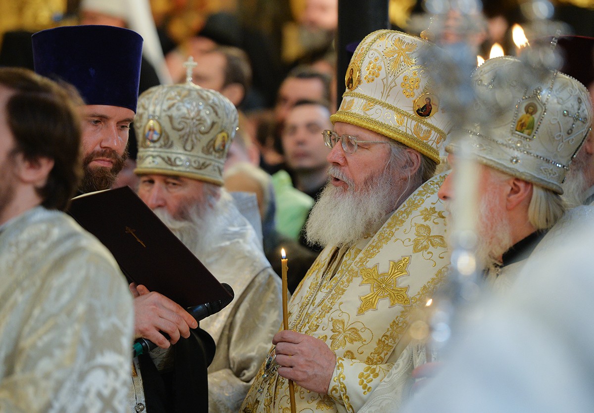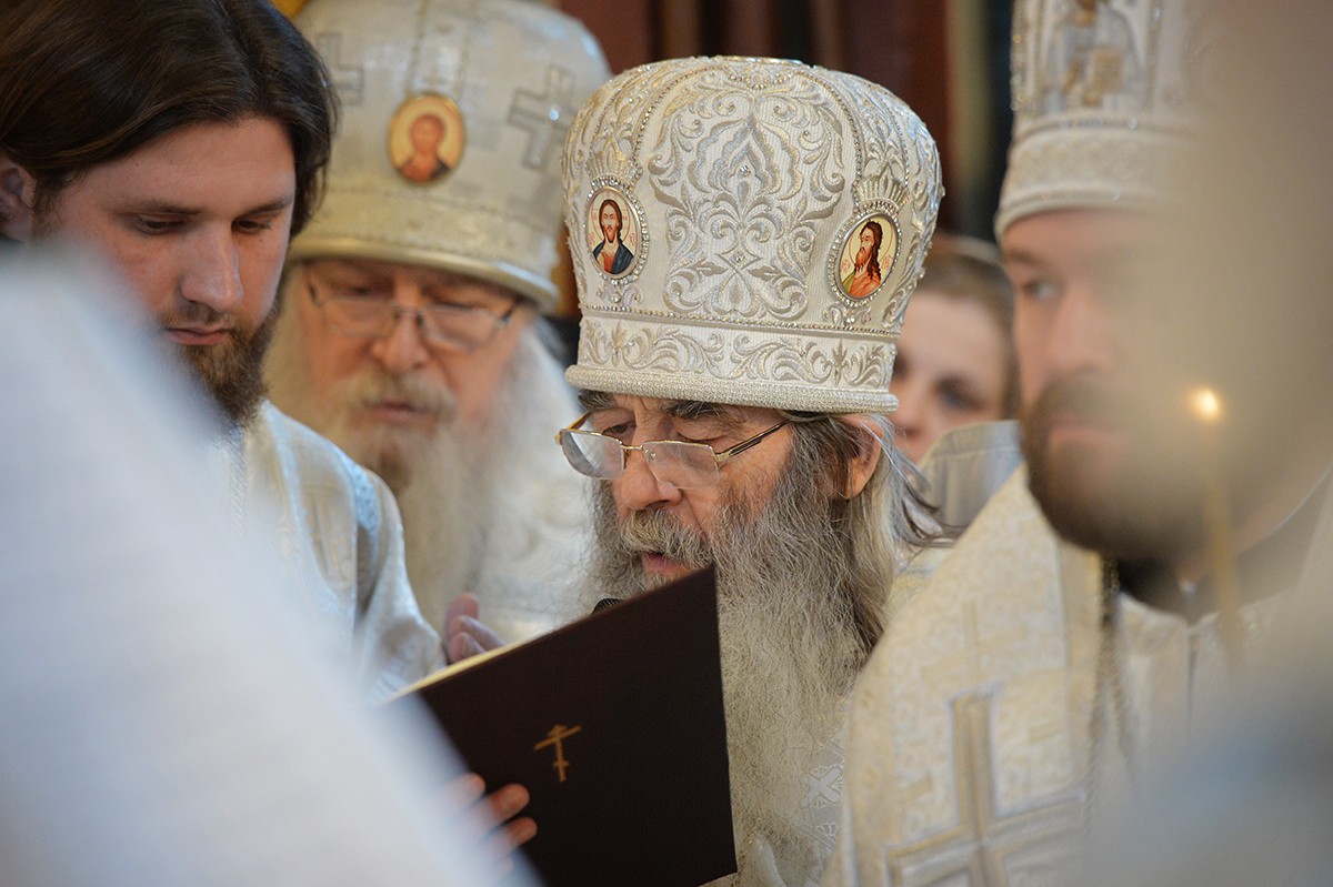 В состоявшемся затем богослужении участвовали: Блаженнейший митрополит Киевский и всея Украины Онуфрий; митрополит Ташкентский и Узбекистанский Викентий, глава Среднеазиатского митрополичьего округа; митрополит Волоколамский Иларион, председатель Отдела внешних церковных связей Московского Патриархата; митрополит Владимирский и Суздальский Евлогий; митрополит Саратовский и Вольский Лонгин; митрополит Черновицкий и Буковинский Мелетий; митрополит Саранский и Мордовский Зиновий; архиепископ Керченский Анатолий; архиепископ Верейский Евгений, ректор Московской духовной академии, председатель Учебного комитета Русской Православной Церкви; архиепископ Сергиево-Посадский Феогност, наместник Троице-Сергиевой лавры, председатель Синодального отдела по монастырям и монашеству; архиепископ Петергофский Амвросий, ректор Санкт-Петербургской духовной академии; епископ Шумский Серафим; епископ Дмитровский Феофилакт, наместник Андреевского ставропигиального мужского монастыря; епископ Троицкий Панкратий, наместник Спасо-Преображенского Валаамского ставропигиального мужского монастыря, председатель Синодальной комиссии по канонизации святых; епископ Рыбинский и Даниловский Вениамин; епископ Щигровский и Мантуровский Паисий; епископ Волынский и Луцкий Нафанаил; епископ Бронницкий Парамон, наместник Донского ставропигиального мужского монастыря; схиархимандрит Илий (Ноздрин); архимандрит Алексий (Поликарпов), наместник Данилова ставропигиального мужского монастыря; архимандрит Порфирий (Шутов), наместник Спасо-Преображенского Соловецкого ставропигиального мужского монастыря; игумен Петр (Еремеев), наместник Высоко-Петровского ставропигиального мужского монастыря; многочисленное духовенство.