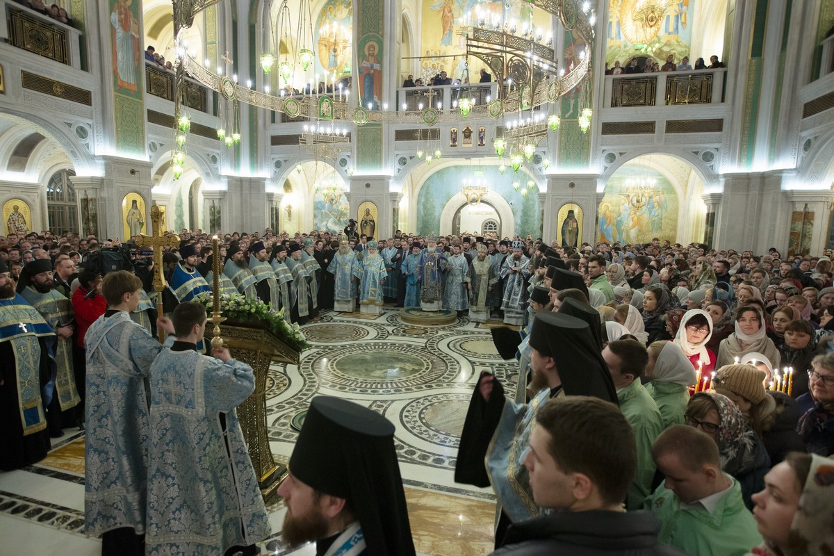 Его Святейшеству сослужили: митрополит Истринский Арсений, первый викарий Патриарха Московского и всея Руси по г. Москве; митрополит Псковский и Порховский Тихон, председатель Патриаршего совета по культуре; архиепископ Сергиево-Посадский Феогност, председатель Синодального отдела по монастырям и монашеству, наместник Свято-Троицкой Сергиевой лавры; епископ Воскресенский Дионисий; протопресвитер Владимир Диваков, секретарь Патриарха Московского и всея Руси по г. Москве; иеромонах Иоанн (Лудищев), и.о. наместника Сретенского ставропигиального монастыря; протоиерей Олег Клемышев, благочинный Сретенского округа, настоятель храма Успения Пресвятой Богородицы в Печатниках г. Москвы; насельники Сретенского монастыря в священном сане.