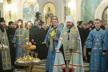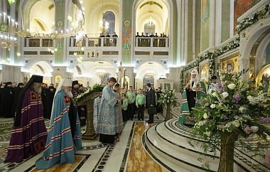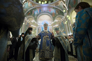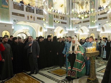 По прибытии в храм Воскресения Христова и Новомучеников и исповедников Церкви Русской Святейший Патриарх поклонился честным мощам священномученика Илариона (Троицкого), архиепископа Верейского. Затем Предстоятель Русской Православной Церкви возглавил служение всенощного бдения.