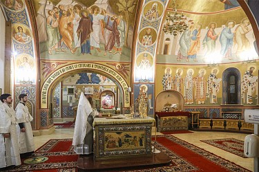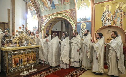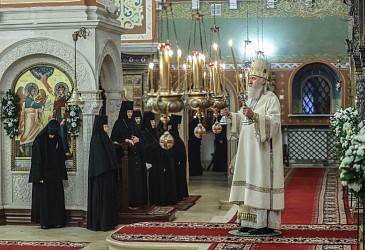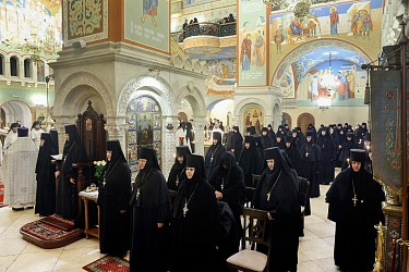 За Литургией молились участники заседания монашеского направления XXXII Международных Рождественских образовательных чтений ‒ игумены и игумении, насельники монастырей.