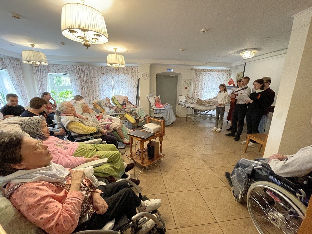 Между песнями состоялось теплое общение, на котором дедушки, бабушки и сёстры милосердия делились историями из жизни, прочитанными книгами, мечтами и целями.