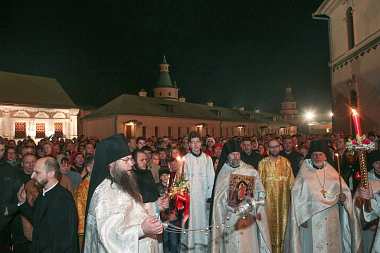 После чтения полунощницы и совершения крестного хода наместник обители игумен Феофилакт (Безукладников) возглавил Пасхальную утреню и Божественную литургию в полностью отреставрированном Воскресенском соборе – главном монастырском храме.