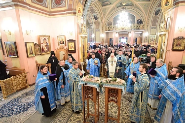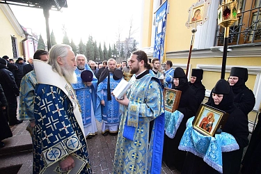 За Божественной литургией Его Высокопреосвященству сослужили: протопресвитер Владимир Диваков, секретарь Патриарха Московского и всея Руси по г. Москве, протоиерей Олег Егоров, благочинный Покровского церковного округа г. Москвы, духовенство обители.