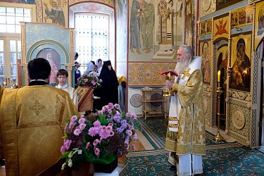 Его Высокопреосвященству сослужили штатный клирик обители протоиерей Владимир Постников и клирик Заиконоспасского мужского ставропигиального монастыря Москвы иеромонах Савва (Буханцев).