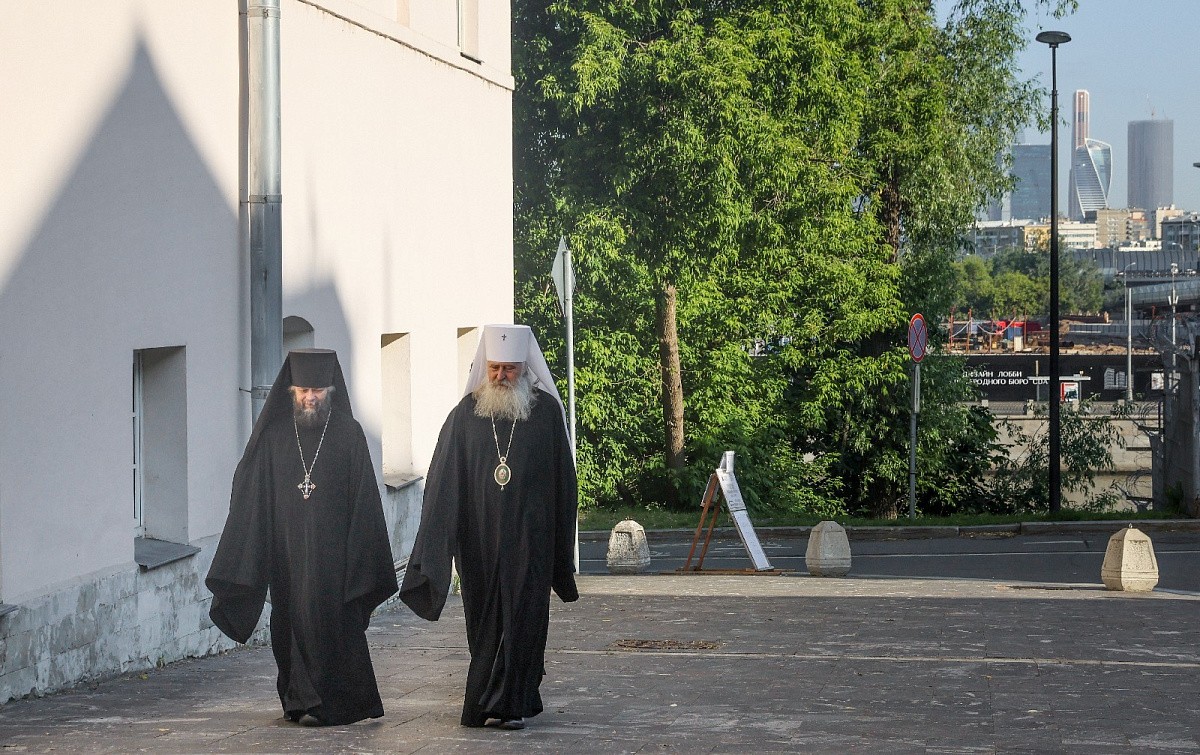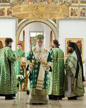 Его Высокопреосвященству сослужили наместник Андреевского монастыря игумен Дионисий (Шлёнов), братия обители в священном сане.