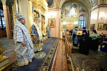 По прибытии в обитель архипастыри поклонились честным мощам блаженной Матроны Московской, почивающим в Покровском храме, а затем возглавили Божественную литургию в храме Воскресения Словущего.