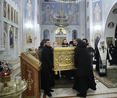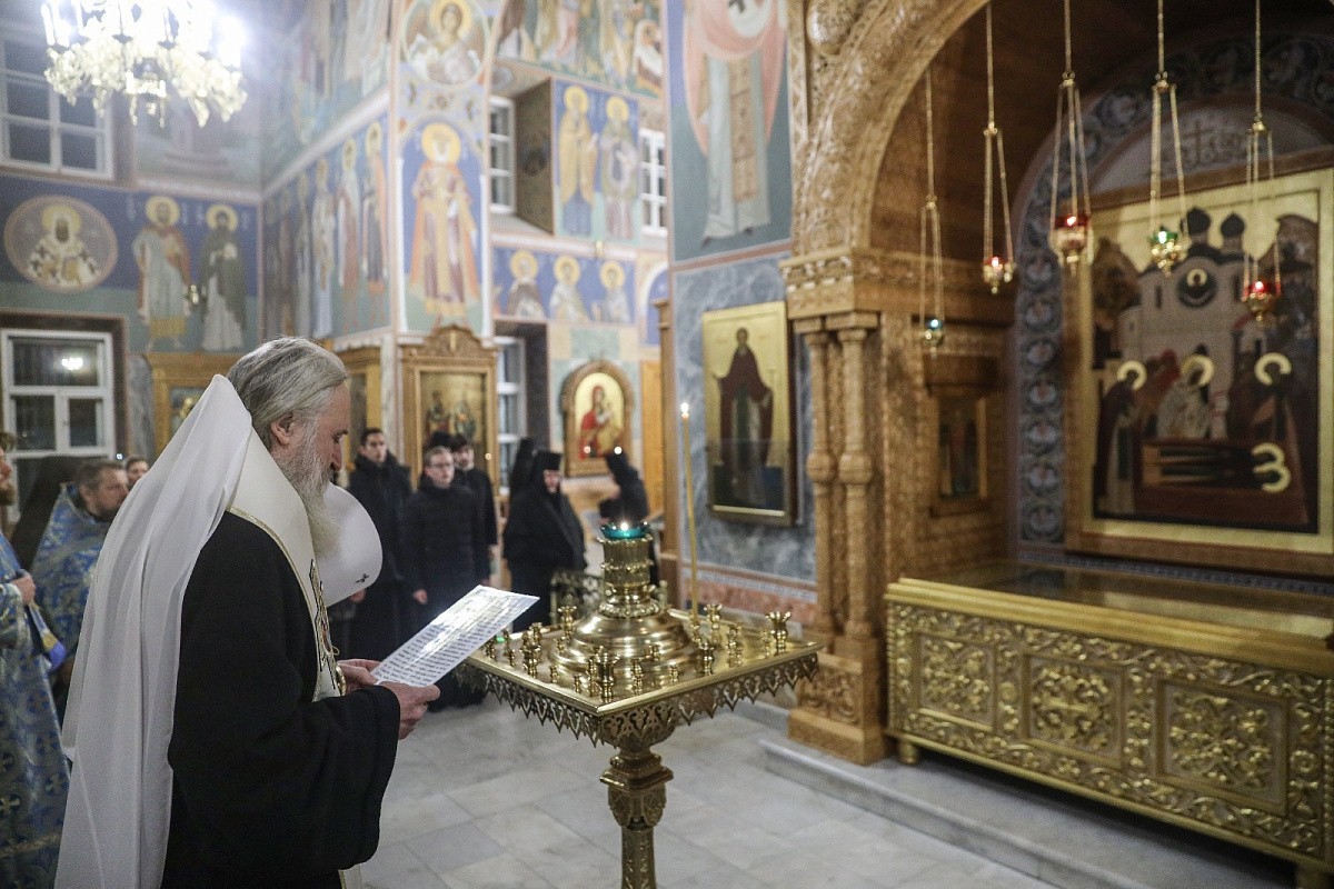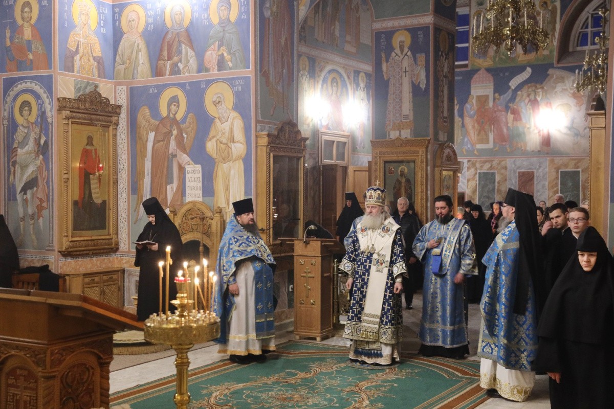 Перед началом богослужения был совершен перенос раки с честными мощами преподобных Кирилла и Марии крестным ходом из Никольского собора в Покровский храм обители. После чего митрополит Феогност прочитал молитву преподобным Кириллу и Марии.