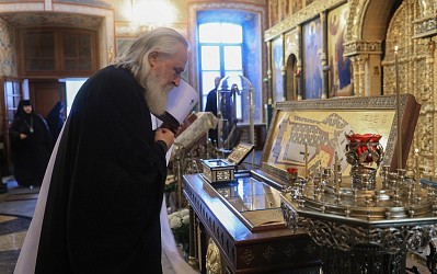 По окончании Литургии митрополит Феогност зачитал игумении Елисавете поздравление с днем тезоименитства от Святейшего Патриарха Московского и всея Руси Кирилла.