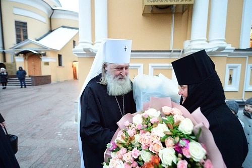 Затем митрополит Феогност огласил поздравление Святейшего Патриарха Московского и всея Руси Кирилла в адрес игумении Феофании с 30-летием назначения на должность настоятельницы Покровского монастыря: