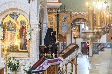 По прибытии в монастырь митрополит Феогност поздравил настоятельницу Зачатьевской обители игумению Иулианию (Каледу) с днем пострига и днем рождения и вручил ей букет цветов.
