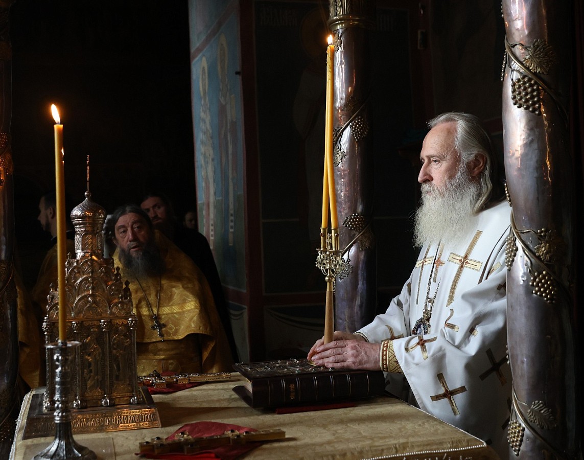 За Литургией Его Высокопреосвященству сослужила братия обители в священном сане.