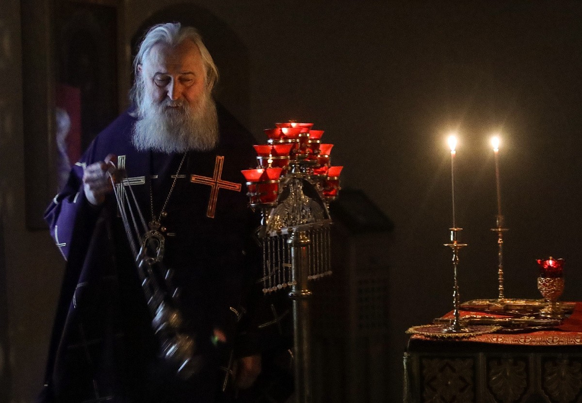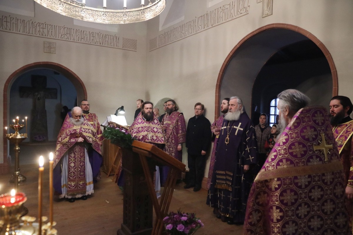 За Литургией Его Высокопреосвященству сослужили наместник Андреевского монастыря игумен Дионисий (Шленов) с братией обители в священном сане.