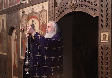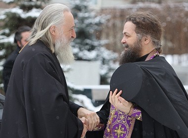 Перед началом богослужения митрополит Феогност поздравил игумена Дионисия (Шленова) с назначением на должность наместника.