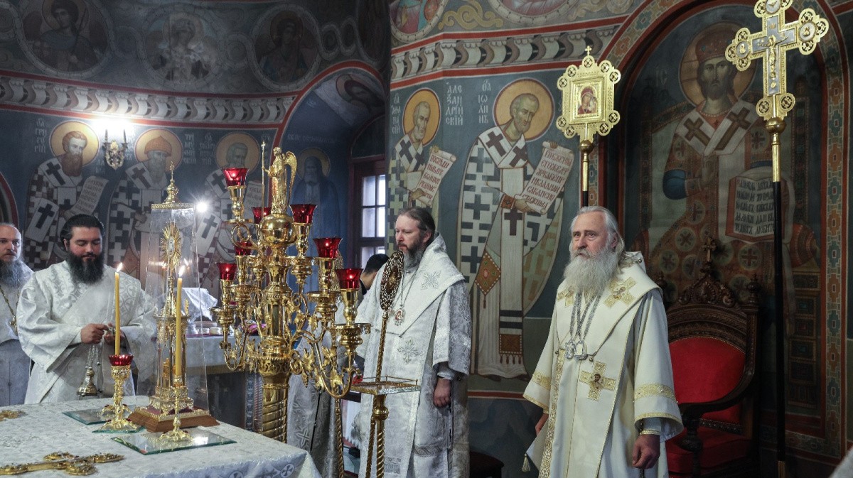 Его Высокопреосвященству сослужили наместник Высоко-Петровского монастыря епископ Луховицкий Евфимий, братия обители в священном сане.