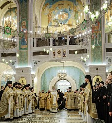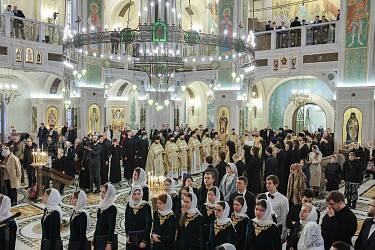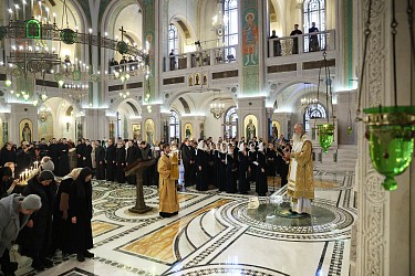 В Литургии вместе с прославленным концертным хором Сретенского монастыря участвовали хор Сретенской духовной академии и Молодежный монастырский хор.