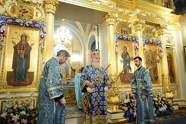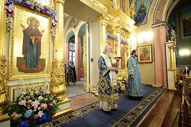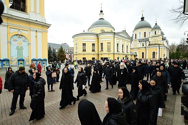 По прибытии в обитель архипастырь поклонился честным мощам блаженной Матроны Московской, а затем возглавил позднюю Божественную литургию в Воскресенском соборе обители.