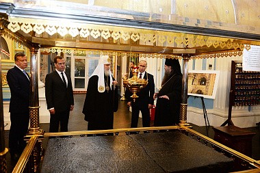 Главу государства сопровождали сопредседатели Попечительского совета Благотворительного фонда, на средства которого восстанавливается монастырь, премьер-министр Дмитрий Медведев и Патриарх Московский и всея Руси Кирилл.