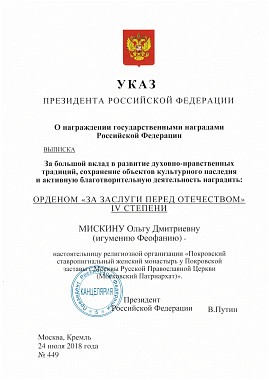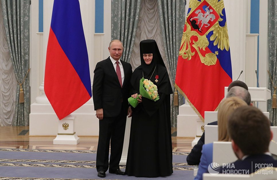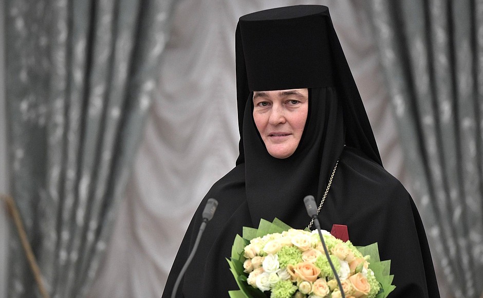 Среди награжденных – настоятельница Покровского ставропигиального женского монастыря Москвы игумения Феофания (Мискина), которой глава государства за большой вклад в развитие духовно-нравственных традиций, сохранение объектов культурного наследия и активную благотворительную деятельность вручил орден «За заслуги перед Отечеством» IV степени.