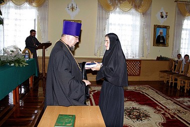 По прочтении доклада ректор РКДУ протоиерей Александр Опанасюк вручил дипломы двенадцати выпускницам Регентского отделения, в числе которых две насельницы Корецкой обители, и четырем выпускницам швейного отделения.