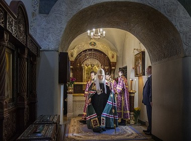 По окончании богослужения игумения Елисавета (Позднякова) приветствовала Предстоятеля Русской Православной Церкви и преподнесла Его Святейшеству иконы Спасителя и Божией Матери.