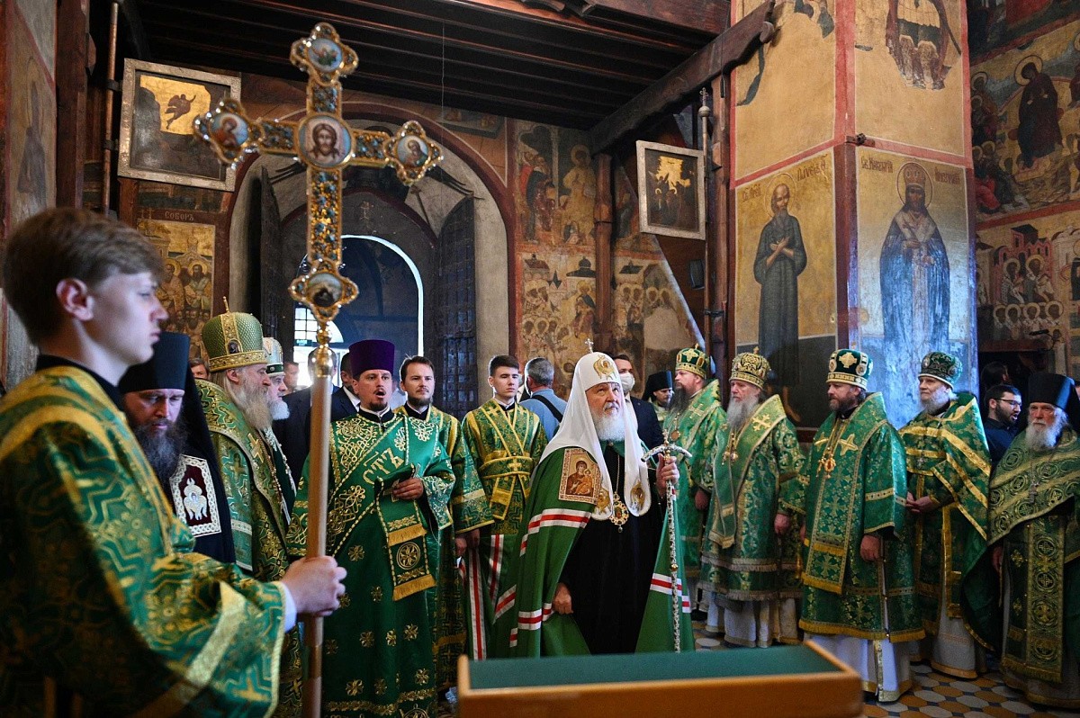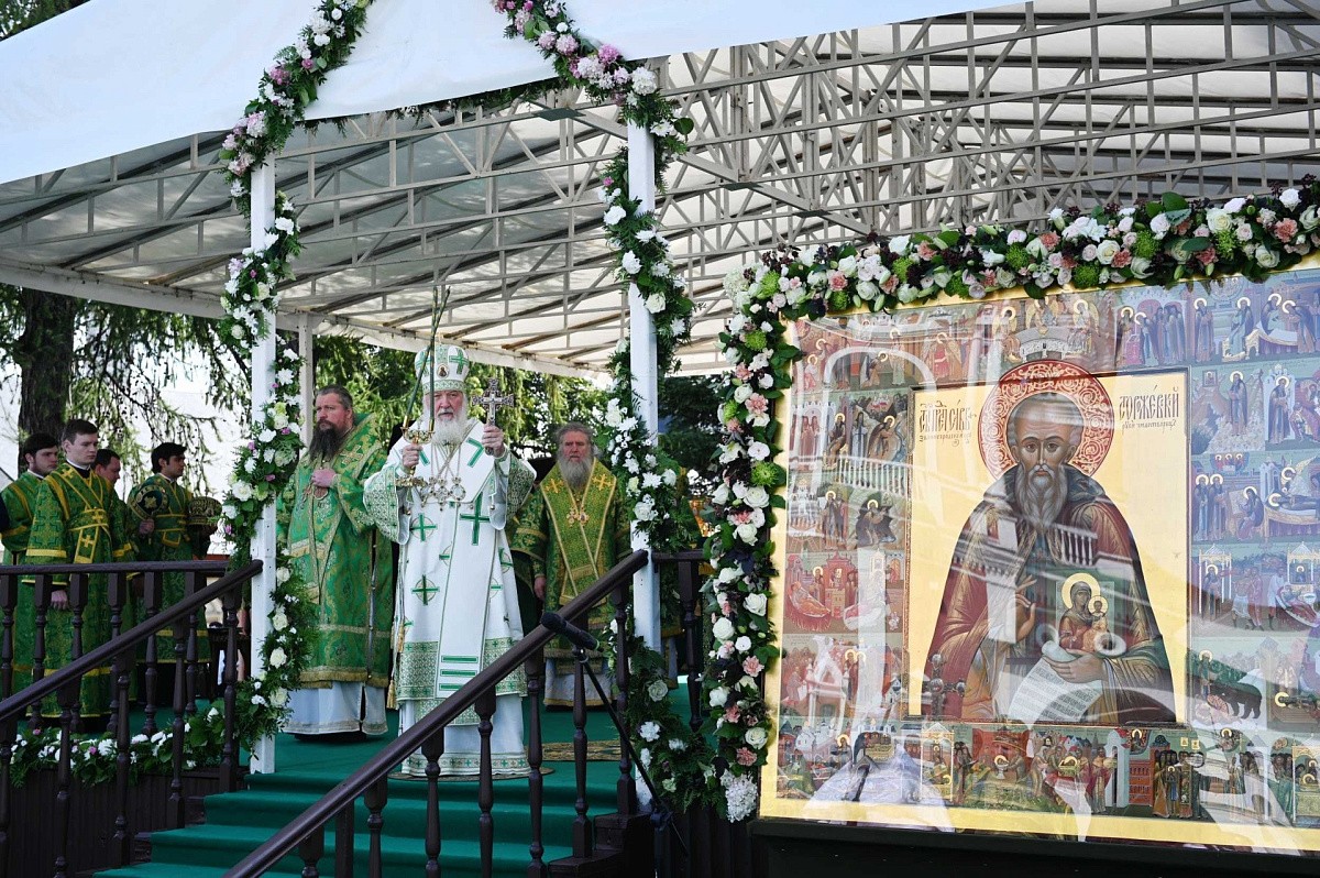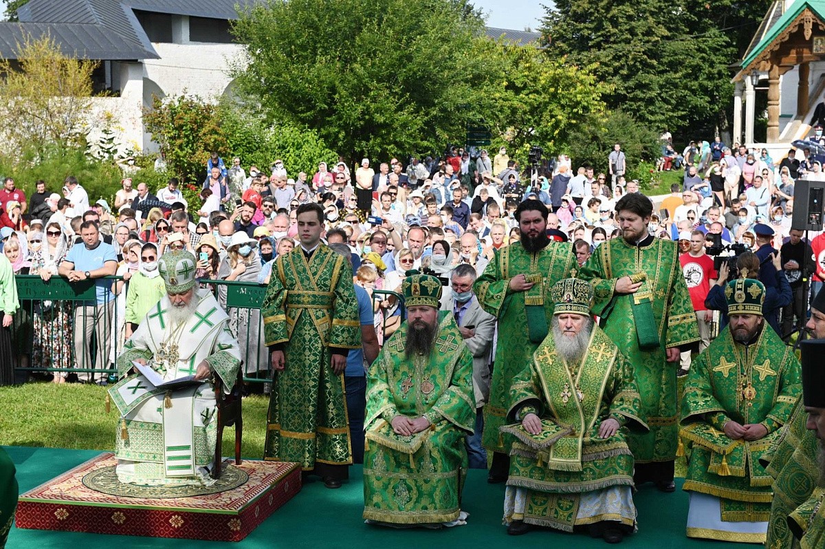 Его Литургией Его Святейшеству сослужили: митрополит Волоколамский Иларион, председатель Отдела внешних церковных связей Московского Патриархата; митрополит Воскресенский Дионисий, управляющий делами Московской Патриархии, первый викарий Патриарха Московского и всея Руси по г. Москве, наместник Новоспасского ставропигиального монастыря; митрополит Виленский и Литовский Иннокентий; архиепископ Витебский и Оршанский Димитрий; архиепископ Каширский Феогност, председатель Синодального отдела по монастырям и монашеству; епископ Павлово-Посадский Фома, руководитель Административного секретариата Московской Патриархии; архимандрит Павел (Кривоногов), наместник Саввино-Сторожевского ставропигиального монастыря; протопресвитер Владимир Диваков, секретарь Патриарха Московского и всея Руси по г. Москве; архимандрит Феофилакт (Безукладников), наместник Ново-Иерусалимского ставропигиального монастыря; архимандрит Сергий (Воронков), наместник Иосифо-Волоцкого ставропигиального монастыря; архимандрит Алексий (Туриков), личный секретарь Святейшего Патриарха; игумен Варфоломей (Петров), наместник Николо-Угрешского ставропигиального монастыря; насельники Саввино-Сторожевского монастыря в священном сане и духовенство г. Москвы.