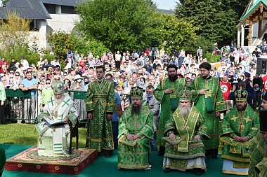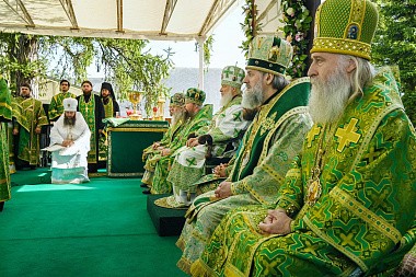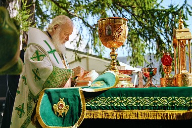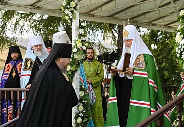 Затем на престоле, установленном под сенью на монастырской площади, Святейший Патриарх Кирилл возглавил служение Божественной литургии.