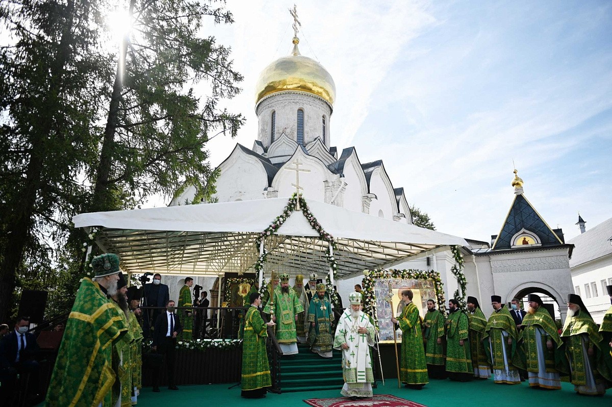У святых врат Предстоятеля Русской Православной Церкви встречали архиереи, прибывшие на праздник в Саввино-Сторожевский монастырь, наместник обители архимандрит Павел (Кривоногов) с братией монастыря, заместитель главы администрации Одинцовского городского округа Московской области В. В. Переверзева, начальник территориального управления Звенигород администрации Одинцовского городского округа Р. Х. Мангушев.