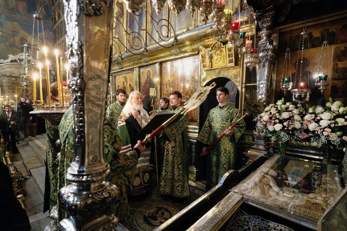 Перед началом богослужения Святейший Владыка поклонился честным мощам преподобного Сергия Радонежского.