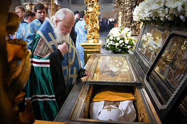 В завершение молебна Предстоятель Русской Православной Церкви прочитал молитву у раки с мощами святителя Тихона. Святейший Владыка поклонился честным мощам святителя, а также Донской иконе Божией Матери.