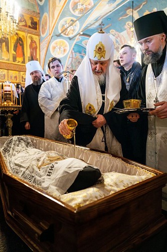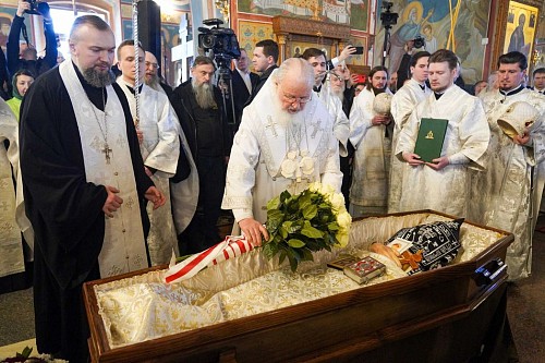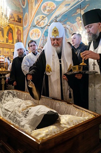 По традиции Святейший Патриарх Кирилл огласил и вложил в руки усопшего грамоту с разрешительной молитвой.