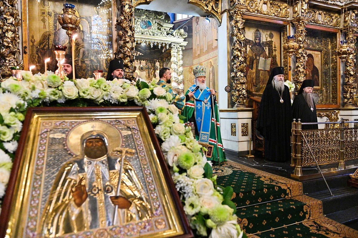В Большом соборе обители, где покоятся честные мощи святителя Тихона, Предстоятель Русской Православной Церкви совершил молебен.