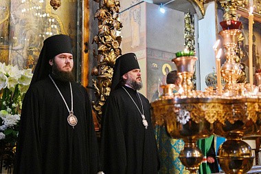 Его Святейшеству сослужили: архиепископ Каширский Феогност, председатель Синодального отдела по монастырям и монашеству; архиепископ Верейский Амвросий, наместник Сретенского ставропигиального монастыря, ректор Сретенской духовной семинарии; епископ Бронницкий Фома, наместник Донского монастыря, первый заместитель председателя Финансово-хозяйственного управления Московского Патриархата; епископ Солнечногорский Алексий, наместник Данилова ставропигиального монастыря; протоиерей Александр Фарковец, благочинный Донского церковного округа г. Москвы; насельники Донской обители в священном сане.