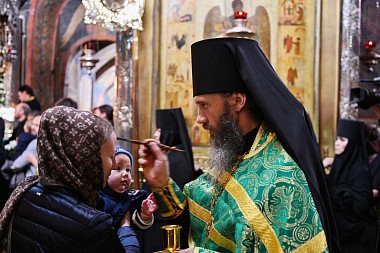 За богослужением молились заместитель председателя Синодального отдела по монастырям и монашеству, настоятельница Зачатьевского ставропигиального монастыря игумения Иулиания (Каледа), настоятельницы ряда женских монастырей Русской Православной Церкви, прибывшие в Лавру на престольный праздник.