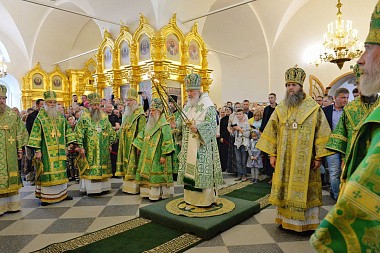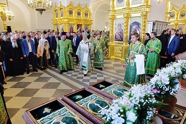 Его Святейшеству сослужили: митрополит Санкт-Петербургский и Ладожский Варсонофий, управляющий делами Московской Патриархии; митрополит Архангельский и Холмогорский Даниил; архиепископ Сергиево-Посадский Феогност, председатель Синодального отдела по монастырям и монашеству, наместник Свято-Троицкой Сергиевой лавры; архиепископ Солнечногорский Сергий, руководитель Административного секретариатаМосковской Патриархии; архиепископ Петропавловский и Камчатский Артемий; архиепископ Егорьевский Матфей; епископ Нарьян-Марский и Мезенский Иаков; епископ Котласский и Вельский Василий; епископ Домодедовский Иоанн, наместник Новоспасского ставропигиального монастыря; епископ Плесецкий и Каргопольский Александр; архимандрит Ипатий (Голубев), избранный во епископа Анадырского и Чукотского; архимандрит Порфирий (Шутов), наместник Соловецкого монастыря; насельники Соловецкой обители в священном сане.