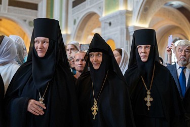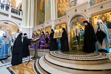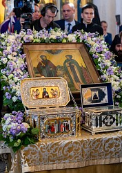 Перед богослужением состоялась торжественная встреча двух ковчегов с честными мощами двух великих русских святых – преподобной Евфросинии Полоцкой и преподобной Евфросинии Московской. Мощи преподобной Евфросинии Полоцкой принесены из Спасо-Евфросиниевского монастыря г. Полоцка (Республика Беларусь), мощи преподобной Евфросинии Московской – из кафедрального соборного Храма Христа Спасителя г. Москвы. В ближайшие недели ковчег с мощами прп. Евфросинии Полоцкой будет принесен в епархии России, а ковчег с мощами прп. Евфросинии Московской – в епархии Белорусского экзархата.