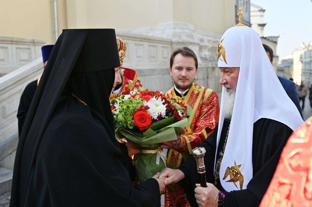 Затем Предстоятель Русской Церкви напутствовал на служение игумению Елисавету, которая была избрана настоятельницей Иоанно-Предтеченского монастыря на последнем заседании Синода 30 августа с.г., а также поздравил участников богослужения с праздником: