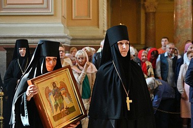 По завершении богослужения игумения Елисавета (Никишкина) приветствовала Предстоятеля Русской Православной Церкви и преподнесла Его Святейшеству икону св. Иоанна Крестителя.