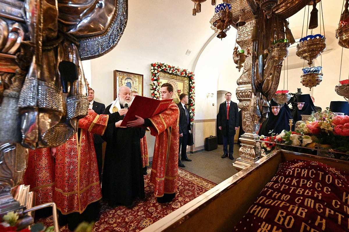 По прибытии в монастырь Святейший Патриарх Кирилл поклонился честным мощам блаженной Матроны, почивающим в храме Покрова Пресвятой Богородицы, и прочитал молитву у раки со святыми мощами.