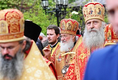 По окончании Литургии Святейший Патриарх Кирилл возглавил крестный вокруг храма.