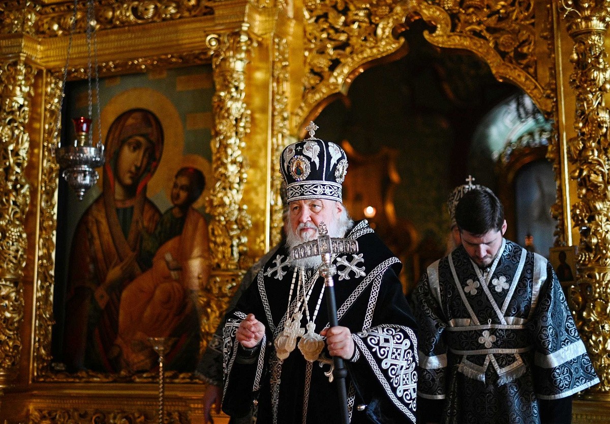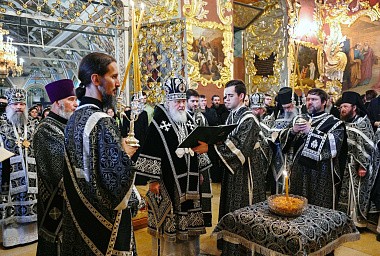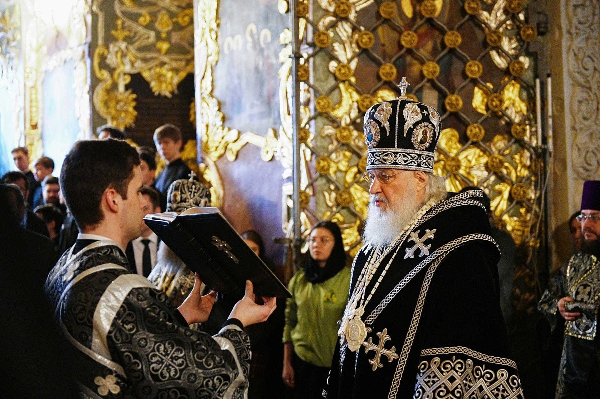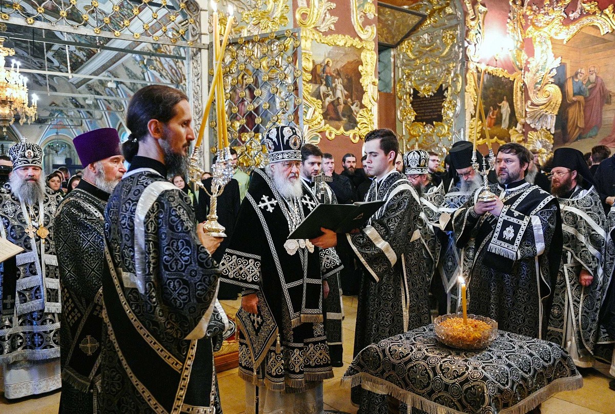 Затем в Трапезном храме в честь преподобного Сергия Радонежского Предстоятель Русской Церкви совершил Литургию Преждеосвященных Даров.
