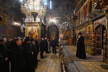 В Троицком соборе Святейший Патриарх Кирилл поклонился честным мощам преподобного Сергия Радонежского и святыням Никоновского придела и Серапионовой палаты.