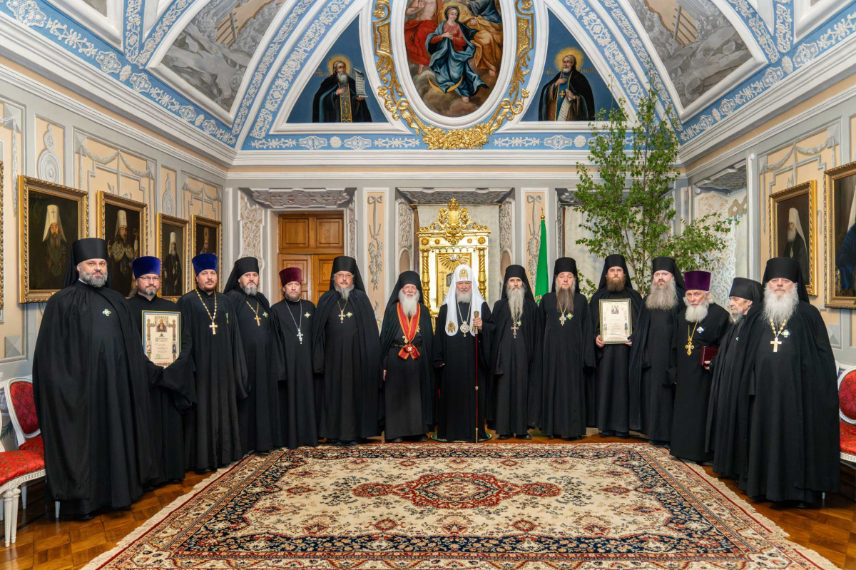 8 июня 2025 года, в праздник Святой Троицы (Пятидесятницы), по окончании Божественной литургии в Свято-Троицкой Сергиевой лавре, в Тронном зале Патриарших покоев обители Святейший Патриарх Московский и всея Руси Кирилл вручил церковные награды ряду насельников Лавры, а также клирикам лаврских подворий, отметившим недавно памятные даты и особо потрудившимся на благо Святой Церкви.
